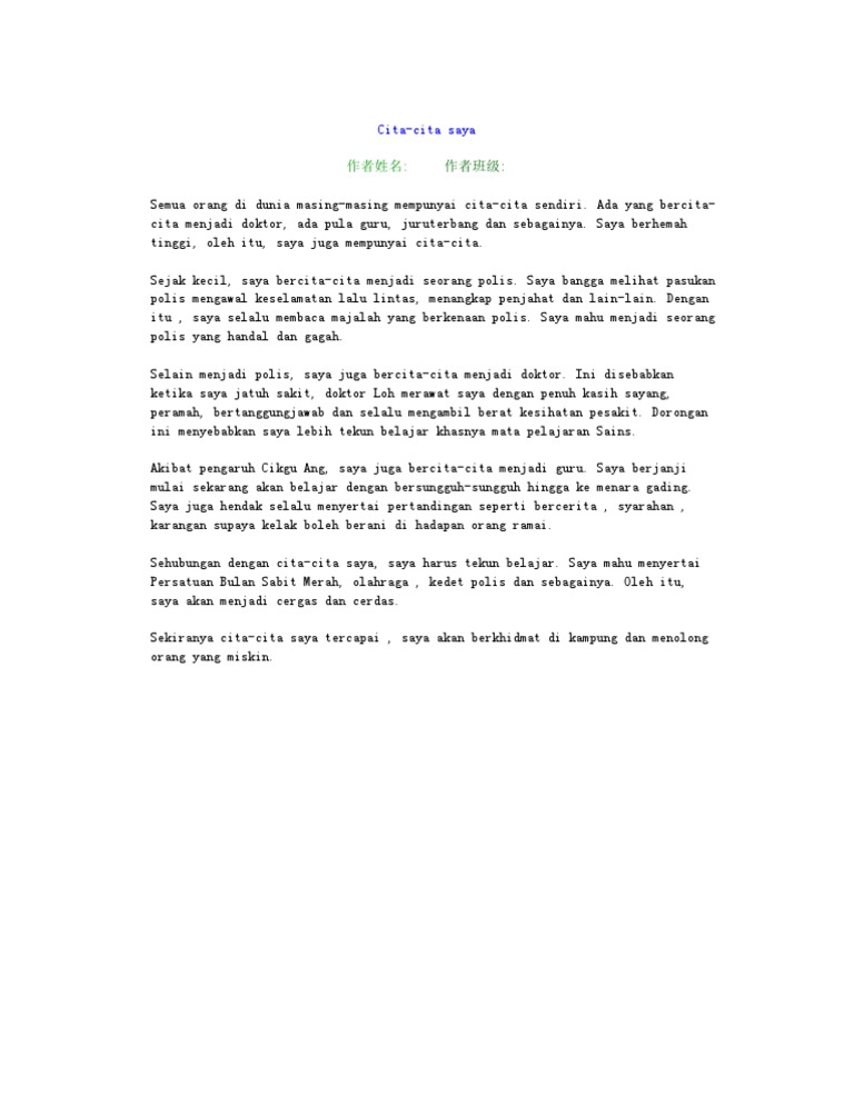 Sungguhpun menjadi tentera bukanlah suatu. Contoh Karangan Bahasa Melayu Tahun 5 Cita Citaku By Oto_845Morgan 19 Jun 2022 Post a Comment Contoh Karangan Cita Cita Saya Menjadi Seorang Guru Otosection Karangan Cita Cita Saya Pdf Karangan Cita Cita Saya Menjadi Guru Otosection Koleksi Karangan Untuk Murid Galus Karangan Taman Negara Belajar Tajuk Karangan Cita Cita Saya Pdf Share. Saya bercita-cita ingin menjadi doktor.